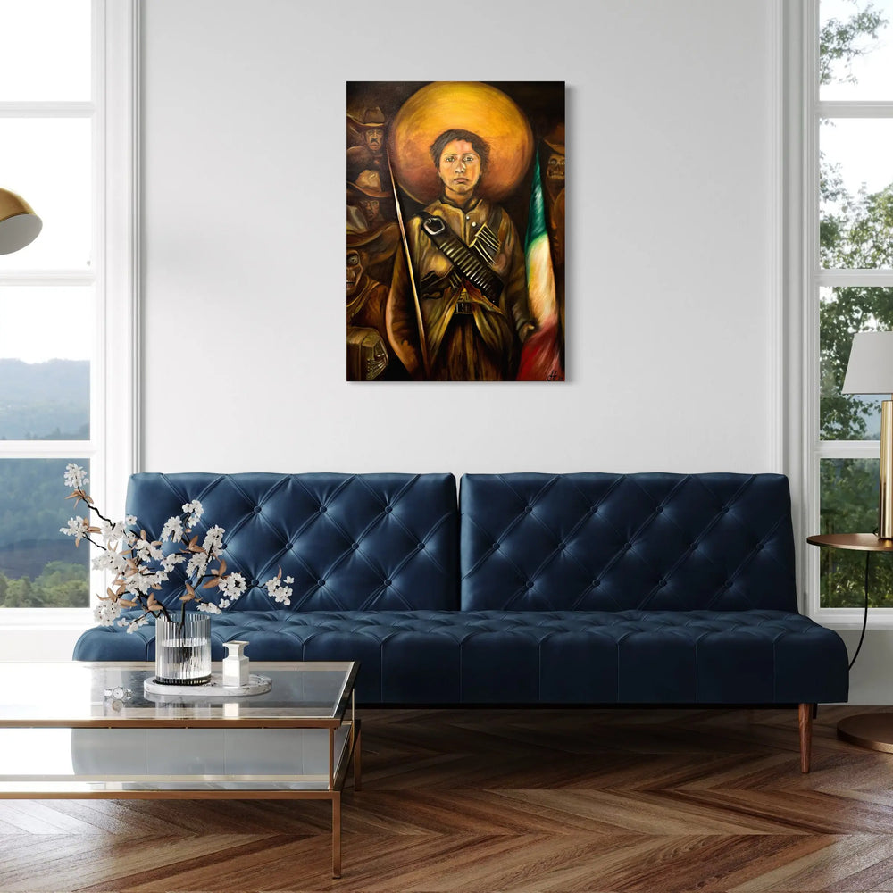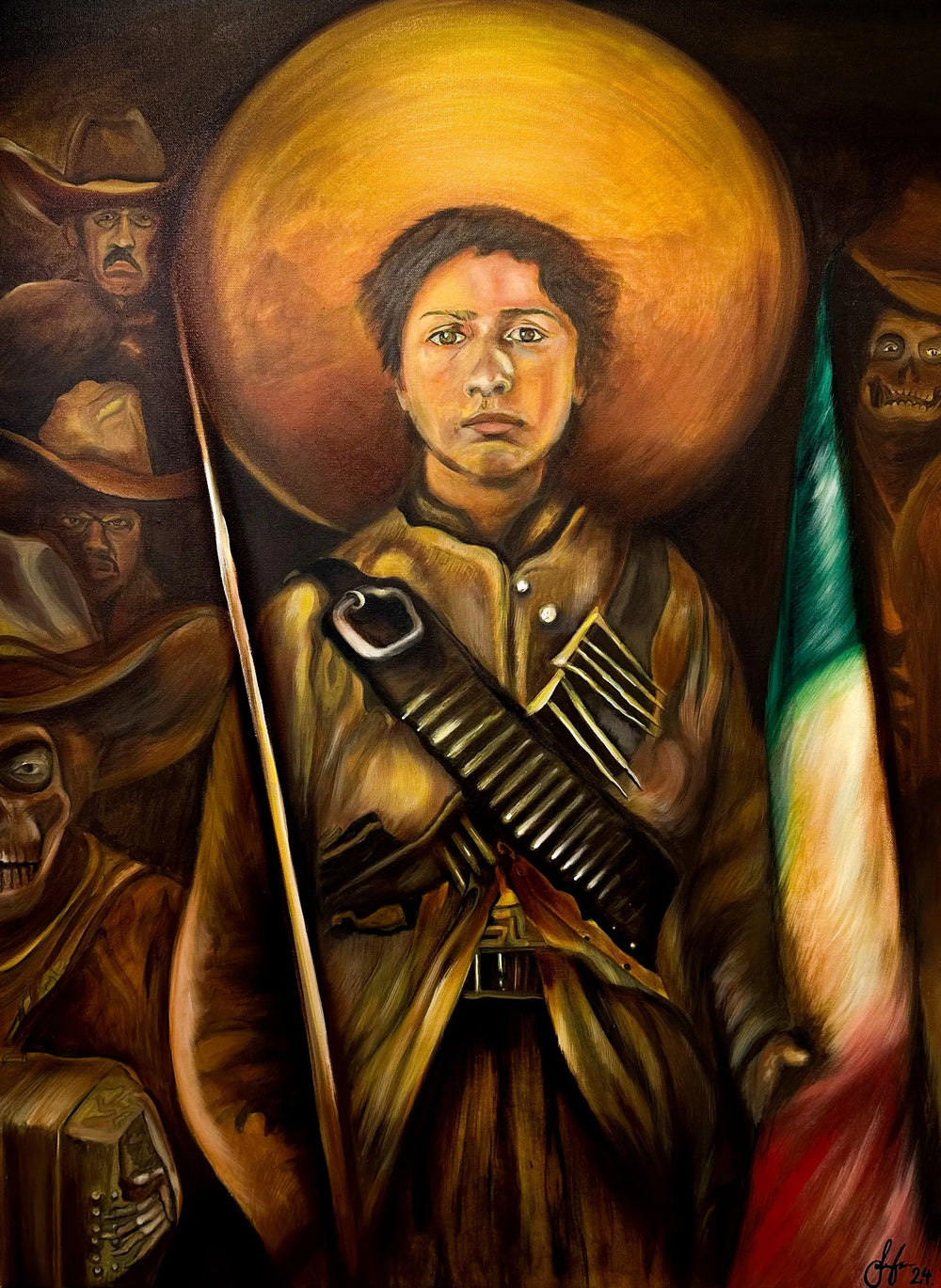 This is a presidential-style portrait of Adela Velarde Perez, a Mexican activist, and Adelita who fought in the Mexican Revolution. The figures in the back are a reflection of our ancestors that fought for our liberty and justice. Who have passed to a better life but have left us patriotic traditions we have embraced and will pass down from generation to generation. This will forever keep their legacy alive.