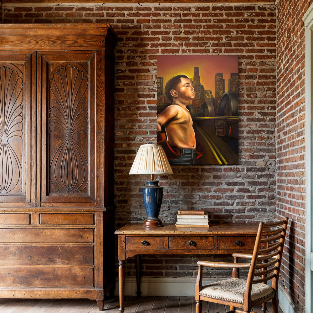 "Mexica Dream" is a powerful 30x40 oil on canvas that opens a window into an artist's transformative journey through boxing. Beginning at age eight, this sport became the defining force in shaping not just athletic prowess, but identity, resilience, and cultural pride within the vibrant Boyle Heights community. This inaugural work in an ambitious boxing series invites you to witness authenticity in motion. Rather than depicting boxing as mere competition, the artist reveals it as a spiritual and personal awakening—a path through which young people discover their strength and reclaim their narratives. Every brushstroke carries the weight of lived experience, the discipline of training, and the triumph of perseverance. Owning "Mexica Dream" means investing in more than visual art; you're supporting an emerging voice committed to documenting stories often overlooked in mainstream galleries. This is the beginning of something significant—a series that promises to deepen and expand as the artist continues translating personal struggle into universal truth. For collectors seeking work with genuine emotional depth and cultural authenticity, this canvas represents an opportunity to connect with art that matters, created by someone who has earned every element of their vision through dedication and heart.